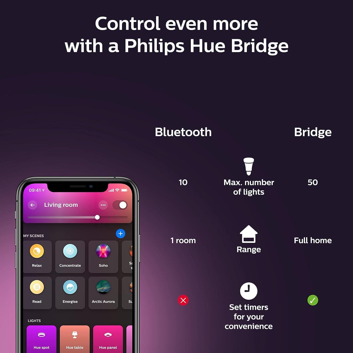UNLOCK THE FULL POWER OF HUE – Add a Hue Bridge to enjoy automations, control from anywhere in the world, and a secure, stable connection that won’t drain your Wi-Fi. Use Matter to connect your smart home devices to your Hue smart lighting system.