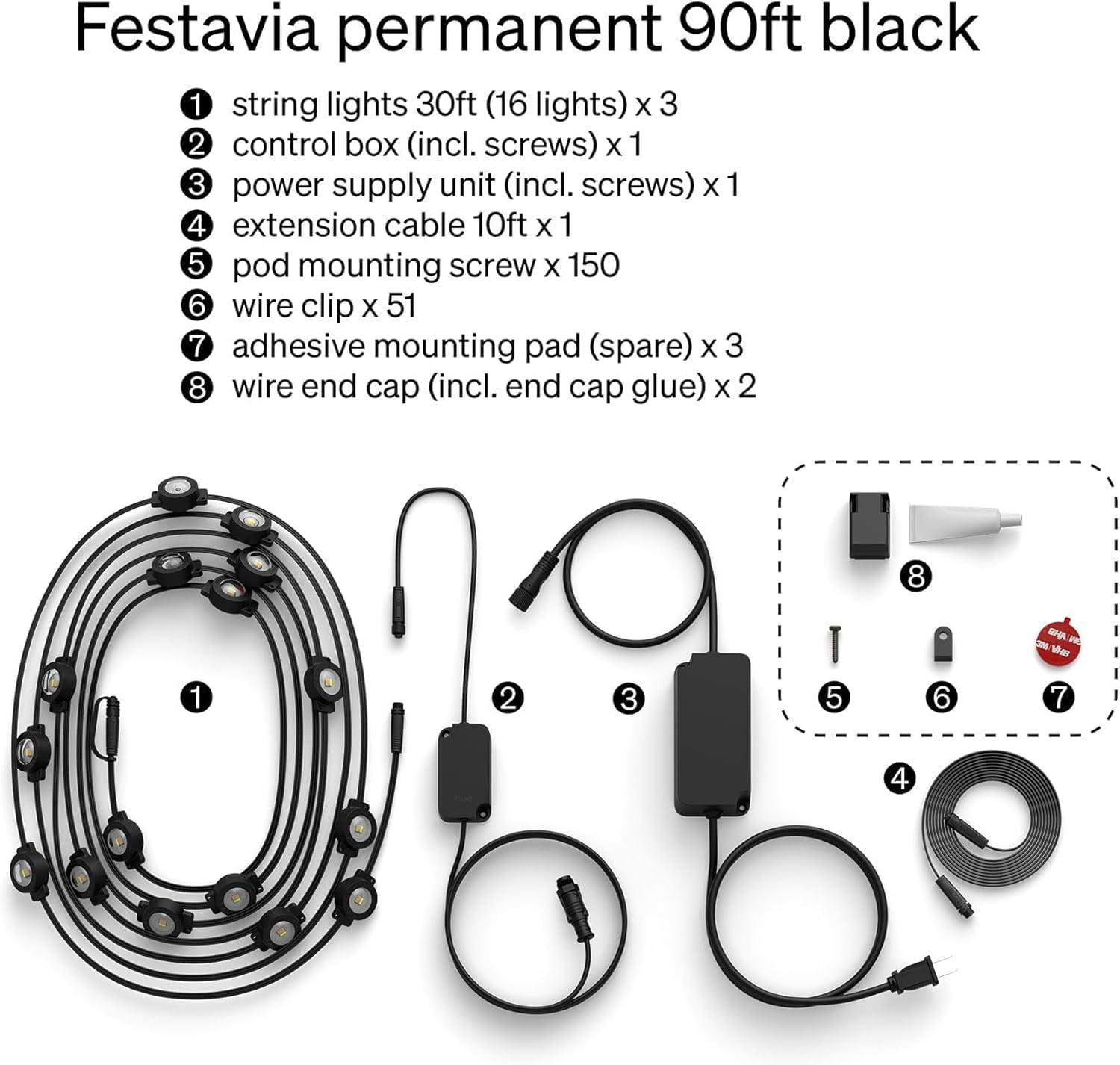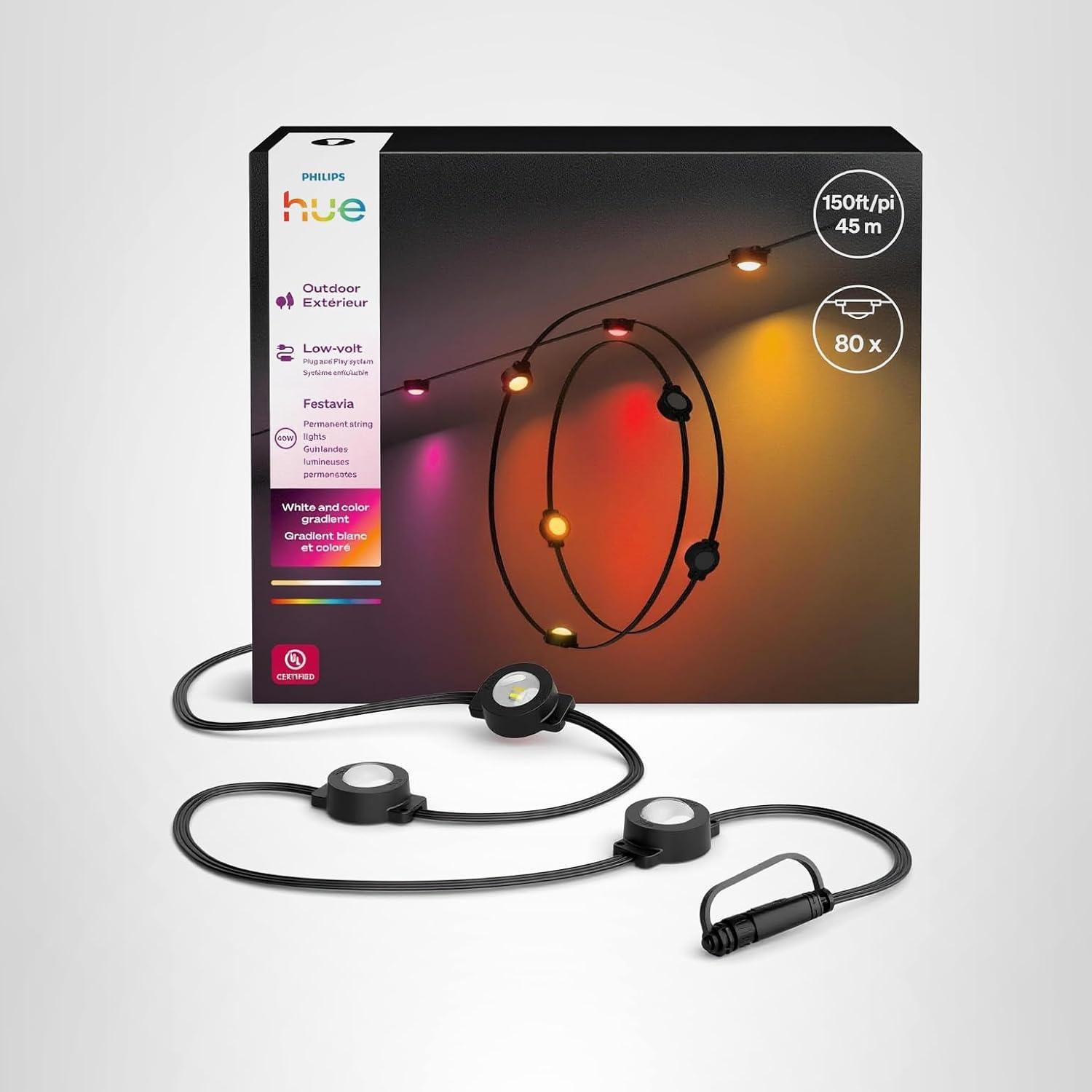 Philips Hue Festavia 90ft Permanent Outdoor String Lights, 48 Dimmable Lights, 55 Lumens Each, Weatherproof, Water-Resistant, Black Wire, Color Ambience, Bridge Required(Black)