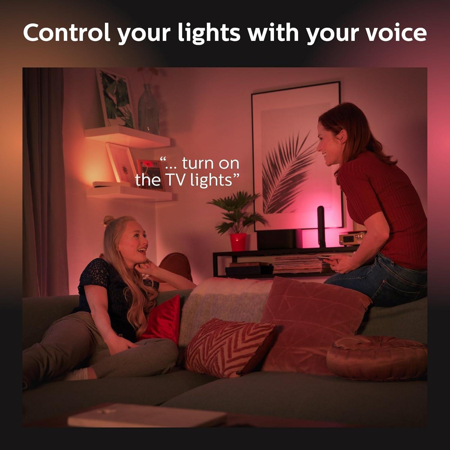 Extend your existing Hue Play light bar setup with the Play White and color ambiance light bar extension pack. This extension pack includes 1 color changing light bar and mounting hardware. Requires a Play light bar base kit with power supply (sold separately). Create a wash of colorful light with the sleek design of the Play light bar. Choose from 16 million colors to experience different light effects. Select preset scenes with dynamic effects or create your own in the Hue app. Lay it horizontally on the floor or stand it vertically on a cabinet or shelf. Create a TV backlight by mounting it to the back of the TV with the included mounts to enhance your home theater setup. Connect to a Hue Sync box (sold separately) to create immersive lighting experiences that sync in real time to your favorite movies, music, and video games. Hue lights can sync with music when you pair them with your Spotify account or listen to music using Samsung SmartThings in the Galaxy smartphone app. Take gaming to a whole new level when you sync Hue lights with Razer Chroma LED accessories and Corsair iCUE products. Requires a Hue Bridge (sold separately). Unlock the full power of Philips Hue smart home lighting with the Bridge and enjoy benefits like multi-room control, automations and smart control from anywhere in the world. Philips Hue is the smart lighting system that lights your home inside and out, all without straining your Wi-Fi.
