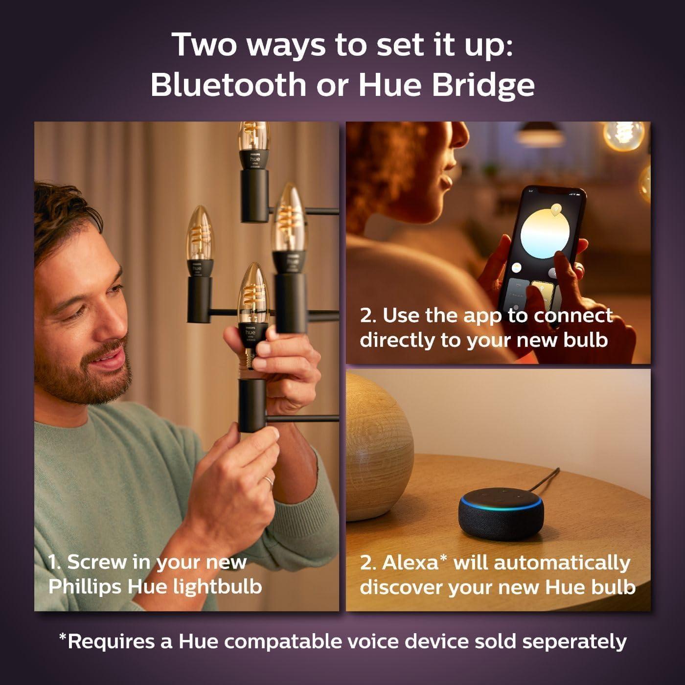 Capture the popular look of Edison bulbs featuring a distinct glowing inner coil and transparent globe, with smart Filament bulbs. These retro-style LED smart candle bulbs are both beautiful and functional, bringing just the right shade of white light to any space. Instantly control your Filament bulb with Bluetooth or add it to your existing Philips Hue system with a Hue HUb. With a Hue Hub, you can control up to 50 smart automations, control your lights while away from home, and add smart accessories such as motion sensors and switches. Connect your Filament bulbs to Amazon Alexa with all Echo smart speakers or displays or Google Assistant with Google Nest devices. The Hue Hub (sold separately) is required for Echo (1st Gen) and Echo Dot (1st Gen). To use with Bluetooth, simply screw in your Filament bulb and download the Hue Bluetooth app and control instantly. To use with a Hue Hub, screw in the Filament bulb and connect via the Philips Hue app. Use the preset Philips Hue light recipes to fit your mood or activities throughout the day. Focus on your tasks with the cool white light of the Concentrate light recipe or unwind with the subtle, soft light of Relax.